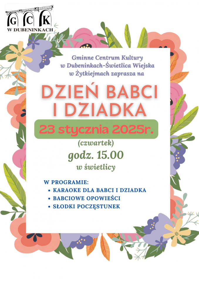 Serdecznie zapraszamy do świetlicy na uroczyste spotkanie z okazji Dnia Babci i Dziadka, 23 stycznia 2025r. o godz. 15.00. W programie: karaoke dla Babci i Dziadka, babciowe opowieści, słodki poczęstunek.