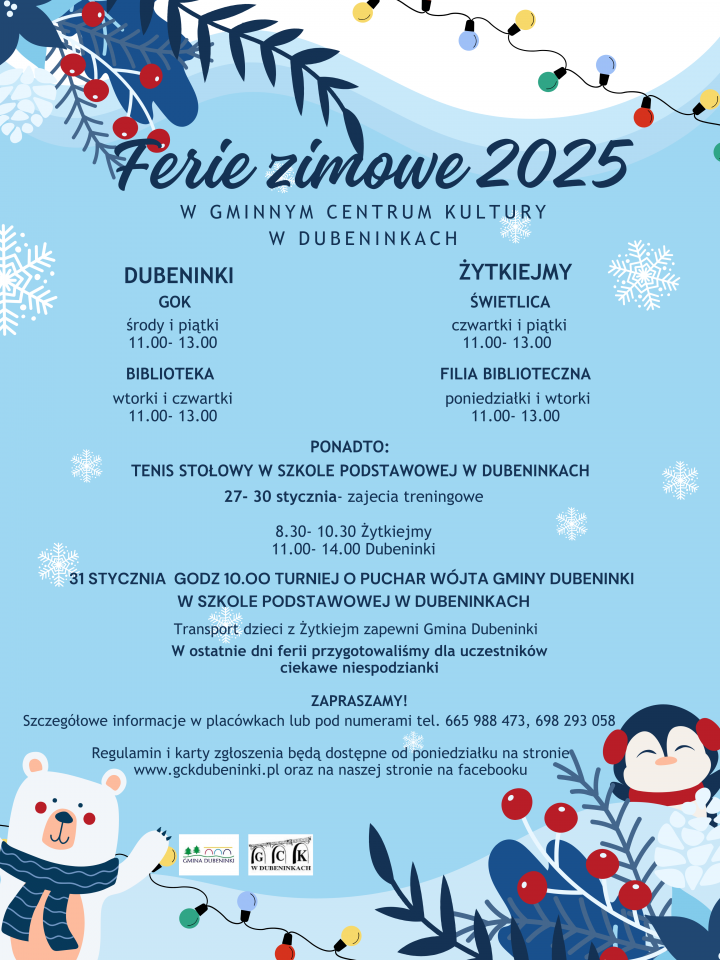 Gminne Centrum Kultury w Dubeninkach zaprasza na zajęcia podczas ferii zimowych 2025. W programie zajęcia plastyczno- rękodzielnicze, zajęcia treningowe i VII edycja TURNIEJU TENISA STOŁOWEGO O PUCHAR WÓJTA GMINY DUBENINKI oraz niespodzianki na zakończenie ferii. Prosimy zapoznać się z regulaminami zajęć oraz wypełnić karty zgłoszenia. Szczegóły w regulaminach oraz w placówkach GCK. Zapraszamy!
